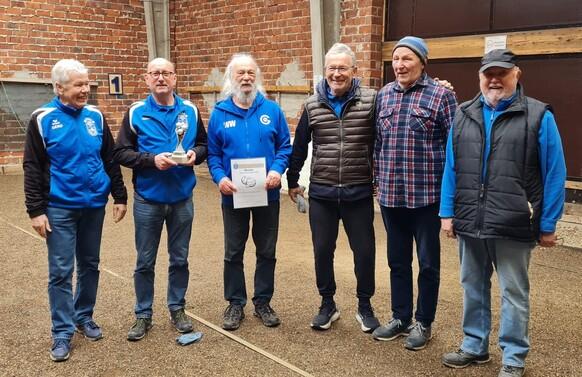 Schon zum zweiten Male haben die Bouler ihre an Ereignissen arme Winterzeit mt einem Langzeitturnier überbrückt, das sich über drei Monate hinzog und am 20.04.2023 mit den Endspielen um die ersten drei Plätze ihren Höhepunkt fand. Innerhalb von zwei Gruppen hatten sich jeweils die ersten beiden Doppel für die Endrunde qualifiziert. Dieses waren in der A-Gruppe Deters/Höötmann und Blömers/Gräser, in der B-Gruppe Merkator/Mülder und Lohmann/Weßling. Um den 1. Platz/2. Platz spielten somit Deters/Höötmann gegen Merkator/Mülder, um den 3. Platz/4. Platz Blömers/Gräser gegen Lohmann/Weßling.